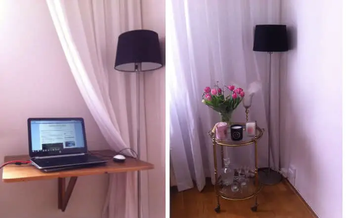Jeg har selv dette fantastiske lille klapbord og blogger fra min stue. Jeg vælter så bordet og trækker et loftgardin for, når der kommer gæster. Du kan se hvad jeg mener ovenfor fra min egen stue. Dette er seriøst et af de smarteste møbler på planeten efter min mening.